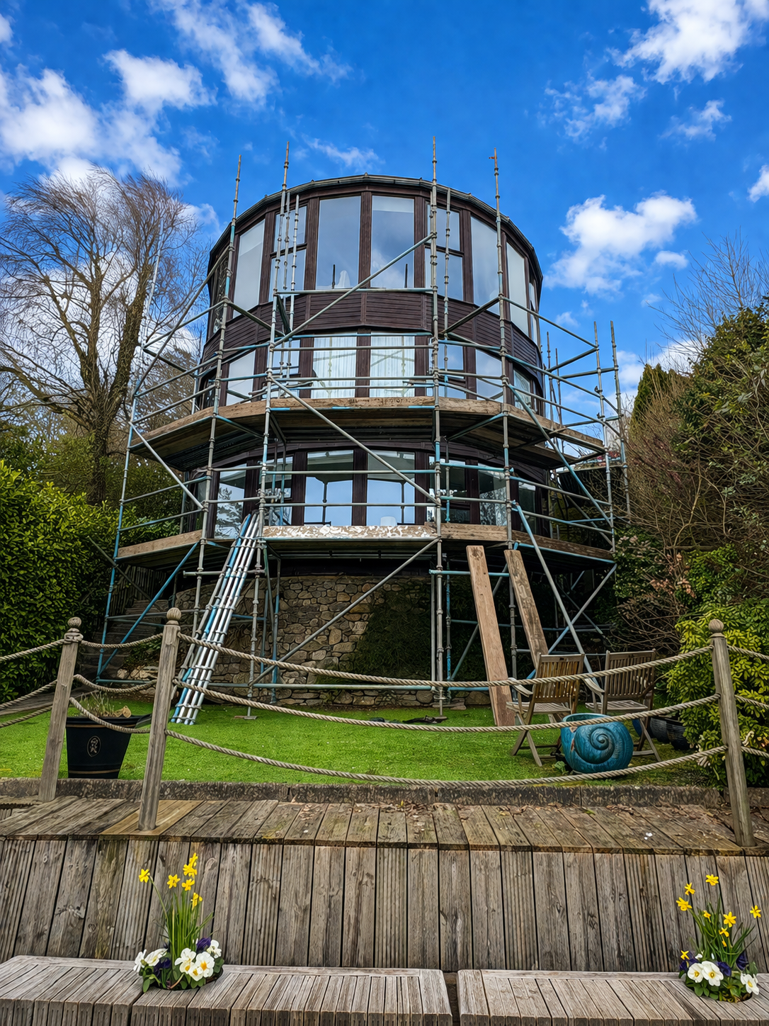 Scaffolding was erected for this private client at their stunning and unique holiday home, Braesyde, in Kippford. The scaffolding access system was designed to safely reach all elevations of the property, enabling the client to carry out essential repairs and resealing works to the windows. The installation ensured full coverage while maintaining stability and efficiency throughout the project.